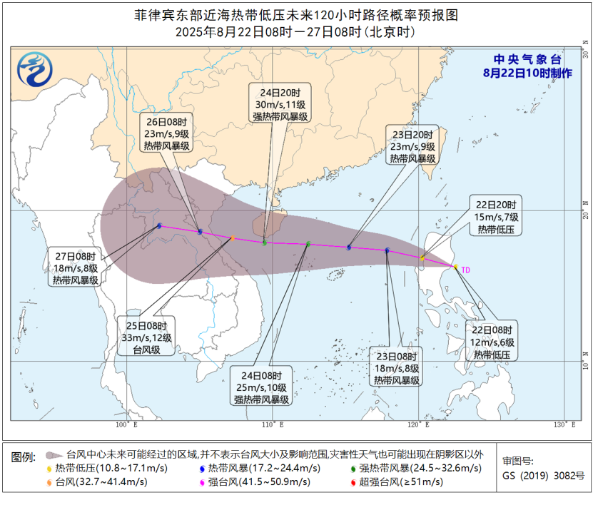 中央气象台8月22日10时发布热带低压预报:菲律宾以东洋面的热带低压已于今天(22日)上午在吕宋岛东部近海生成,其中心上午8点钟位于马尼拉东北方向约250公里的海面上,中心附近最大风力有6级(12米/秒)。