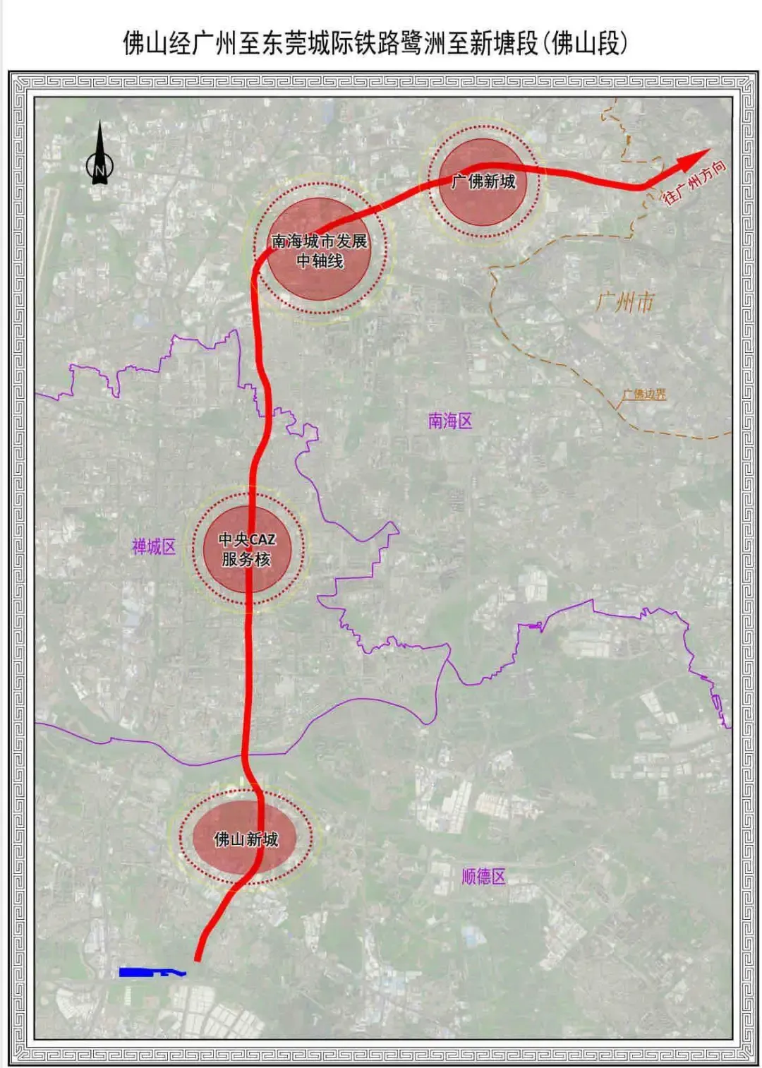 佛穗莞城际鹭洲至新塘段(佛山段)走向示意图