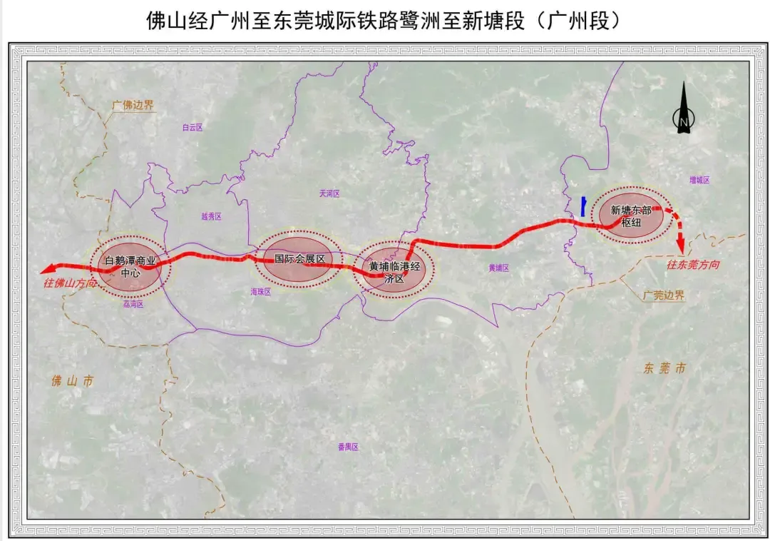 佛穗莞城际鹭洲至新塘段(广州段)走向示意图