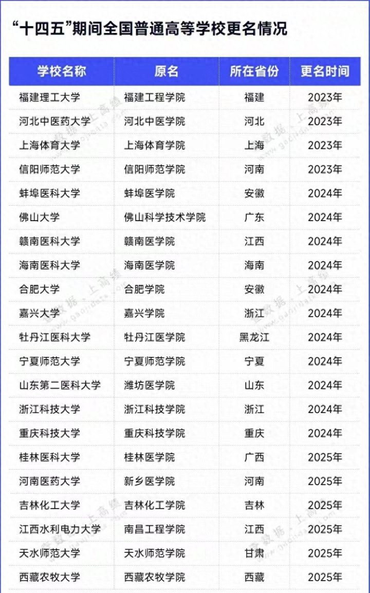 在“十四五”期间,国内已经有上百所高校谋划升格或更名为大学,但真正成功的普本高校却只有21所,分别为:福建理工大学、河北中医药大学、上海体育大学、信阳师范大学、蚌埠医科大学、佛山大学、赣南医科大学、海南医科大学、合肥大学、嘉兴大学、牡丹江医科大学、宁夏师范大学、山东第二医科大学、浙江科技大学、重庆科技大学、桂林医科法大学、河南医药大学、吉林化工大学、江西水利电力大学、天水师范大学、西藏农牧大学。